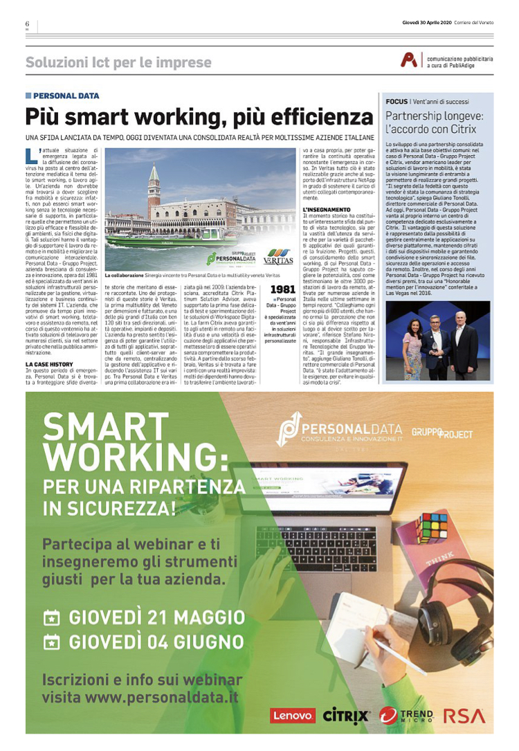 Il quotidiano Corriere della sera – Edizioni di Brescia, Bergamo, Venezia – del 30 aprile 2020, nell’approfondimento legato allo speciale “Soluzioni ICT per le imprese”, ha dedicato un’intera pagina a Personal Data Gruppo Project, ad un progetto vincente di attivazione delle soluzioni di smart working e alla longeva partnership con il vendor americano Citrix.
